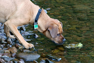 We headed out at our usuall time between 8 and 8:30 a.m. and had a nice paddle through Lake Lavielle. Many canoes and kayaks travelling and trolling. Met some who had cought one lake trout each and a Brookie. "They're deep" they say. A short 90 M portage into Dickson and an easy paddle to our island closest to the portage. This one has a table! Rufus is catching frogs!
